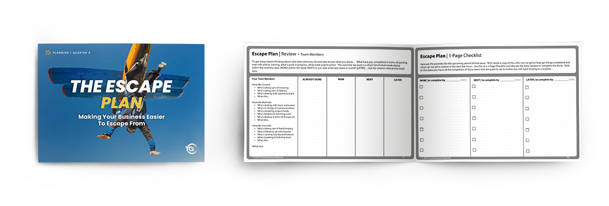 This session addresses the end-of-year period when many business owners will be looking to take a break away (hence “The Escape Plan”). Exercises and templates in this session put in place the people and system requirements in their business to allow the business owner to be absent from their business. The focus is on being able to take a break without the usual “checking in” calls that disrupt so many holidays. Goals are then completed around these projects before completion of the 1-Page Plan.